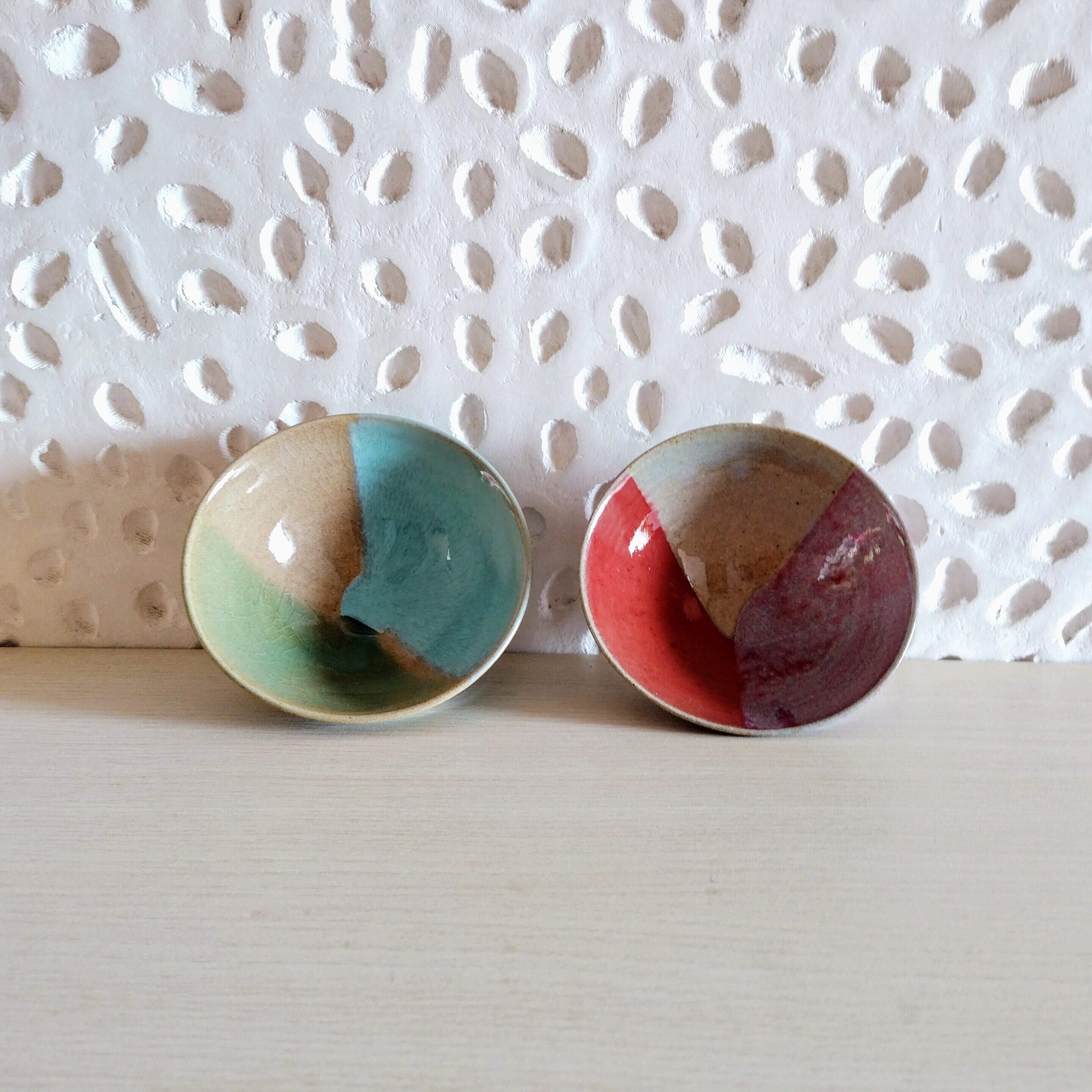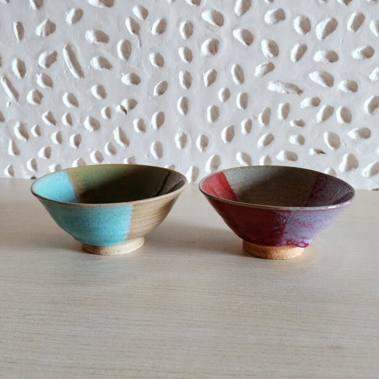 ろくろづくりの掛け分けのご飯茶碗です。どちらも3種の釉薬を掛けています。