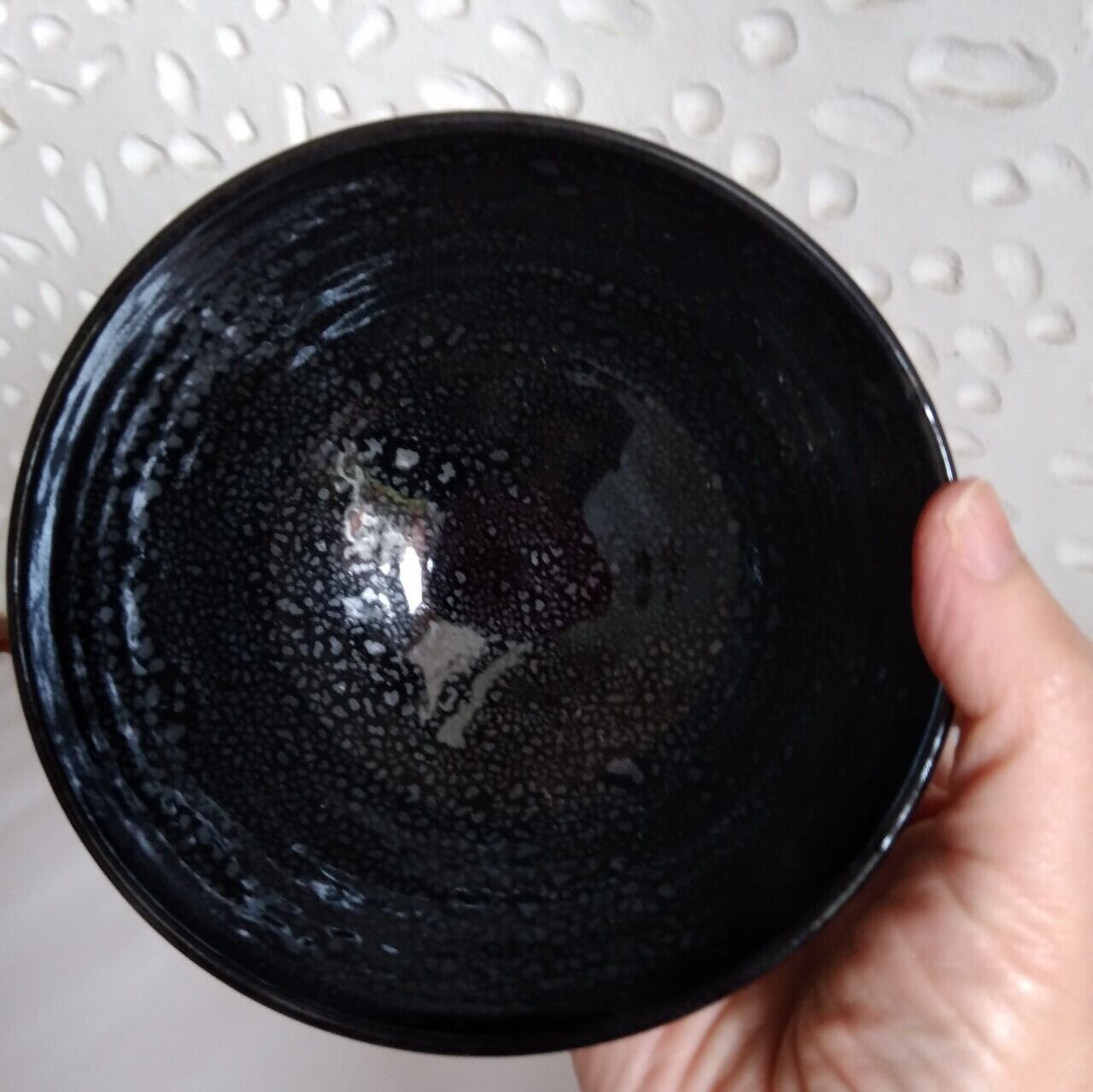 ろくろづくりの大きめの飯茶碗です。油滴天目の釉薬を使った美しい一品です。陶器とは思えない軽さも魅力のひとつです。(直径13㎝ 高さ6.2㎝ 180g 電子レンジ可 陶器)